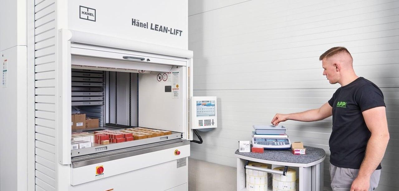 Lagerflächen am Medical Valley-Standort in Forchheim nutzt die Popp GmbH & Co. KG mithilfe des Hänel Lean-Lift(R) effizient, indem die Anlage vertikal bis unter die Decke arbeitet. Die Steuerung MP 14 N mit 12-Zoll-Touchscreen ermöglicht präzise Bedienung. Die PictureControl-Kamera liefert ein Livebild zur sicheren Artikelzuordnung. Eine integrierte Zählwaage sorgt für automatische Mengenanalyse, der Etikettendrucker für klare Kennzeichnung. Zugangscodeverwaltung schützt vor unbefugtem Zugriff. Kurze Wege und deutlich schnelle, strukturierte Prozesse resultieren.